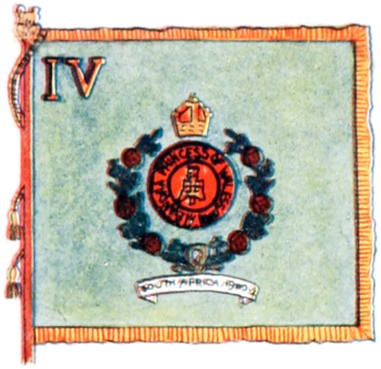 “Her Royal Highness, the Duchess of York and Albany’s Regiment of Foot (4th King’s Own) flies a 11red cross in a yellow field, bordered white, with rays, as that of the Admiral’s, with H.R.Highness’s cypher in the centre.”