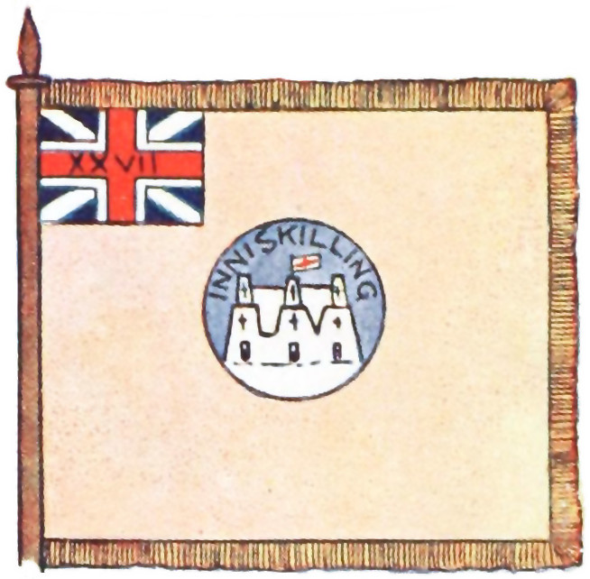 From the end of the reign of James II. to 1707, when England and Scotland formed a legislative union, we can trace but little in the progress of military colours. The Union, however, came and left a very clear impress on the banners of the time. Wherever the red cross of St. George had been used, it was modified with the white cross of St. Andrew, together with its distinctive blue triangular fields. As a rule, the authorities favoured the use of small crosses, placed in the upper canton, rather than large ones covering the whole fabric, for this enabled a fairly big portion of the flag to be used for displaying the arms of each particular military unit. A typical example of this period is shown in Fig. 5. Here we have the colonel’s colour of General Grove’s Regiment, afterwards the 10th Foot (now the Lincolnshire Regiment). The talbot, the motto, and the ermine representations were all features in the crest borne by General Grove. The date of this flag is 1726. Fig. 6, which shows the colours of the 27th or Inniskilling Regiment, is also typical. Its date may be put down at about 1747.
