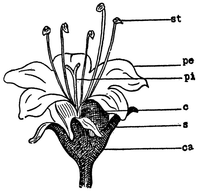 A complete flower: st, stamen; pi, pistil; pe, petal; s, sepal; ca, calyx; c, sorolia. After Bergen.