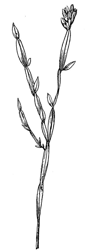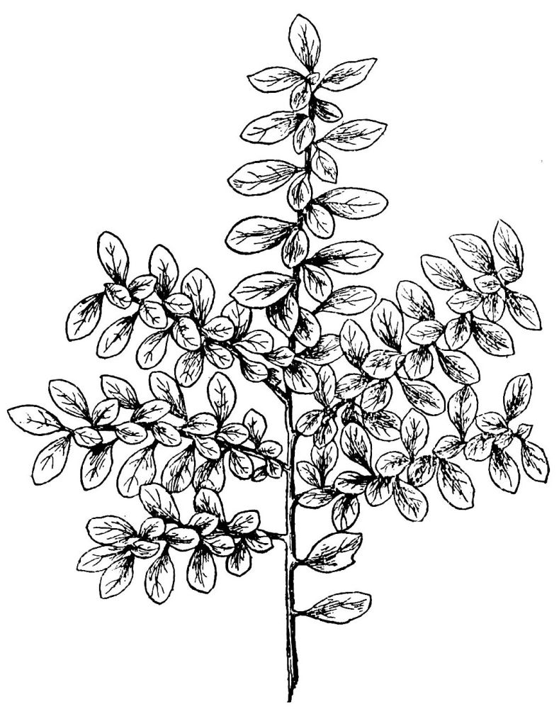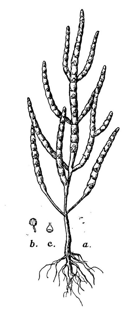 If we turn from the shingle beach to the salt-marsh, where water is very abundant, we shall be struck by the peculiar fact that its vegetation displays characters quite similar to those we have just been studying. How can we reconcile this with the theory that the peculiar characters of the shingle-beach plants are correlated with lack of moisture? The explanation is to be found in the fact that plants have difficulty in absorbing water if it is highly charged with mineral substances in solution. In the salt-marsh the heavy muddy soil is impregnated with common salt (chloride of sodium): the plants absorb it with difficulty; and in consequence they are faced with the same main problem which confronts the Sea Holly and Sea Whin, and they meet it in the same way. Indeed, the salt-marsh plants appear to be more highly specialized, for very few intruders from outside can venture in, while on the beach we may meet with many plants which belong to other formations growing successfully, at least for a time. The salt-marsh flora is very exclusive, and contains but few species which we encounter in other situations. Some of them are also{41} found on dry sea-rocks—the Sea Pink (Statice Armeria), Scurvy-grass (Cochlearia officinalis), Sea Aster (A. Tripolium), and so on; showing that soaking soil is in no way essential to their growth. (The first two reappear among alpine plants on some of our higher mountains, pointing again to an analogy of conditions not altogether understood.) But the salt-marsh formation as a whole is perhaps the most distinctive as regards its composition of any of the plant-groups of our country. It is dominated by such species as the grey leathery-leaved Obione portulacoides, the small-leaved, thick-stemmed Sea Pink, the Sea Wormwood (Artemisia maritima), which is all covered with a silky coat; the pools are fringed with Scirpus Tabernæmontani, a dwarf greyish copy of the Common Bulrush of our lakes, and filled with the narrow-leaved Ruppia and Zannichellia; and in the muddiest places are little forests of Glasswort, leafless, very fleshy, the flowers reduced to mere essentials and buried in the fleshy stems (Fig. 2, p. 18).