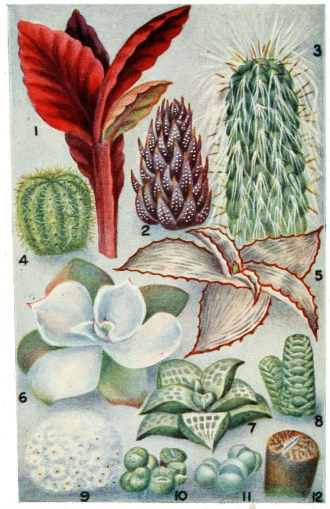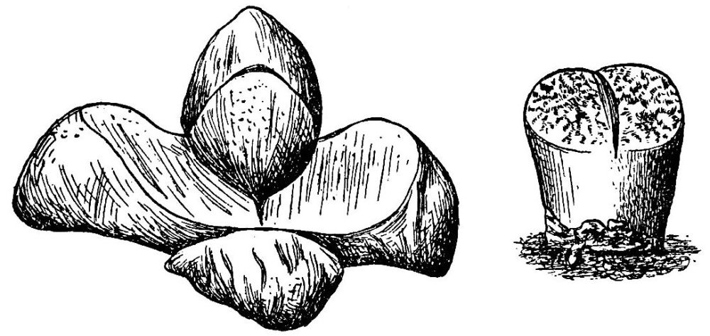 very difficult conditions; yet there are few areas in which the eye will not note some strange vegetable form. In Fig. 3 are illustrated some of the remarkable Mesembryanthemums found in the South African deserts. Here the extremely fleshy leaves, arranged in opposite pairs, produce a sub-globular plant form, a mere mass of watery tissue, which in colour as well as shape appears to mimic the pebbles among which it grows. The frontispiece shows some other types of desert plants. Another difficulty which desert plants have to contend with is this: continual evaporation from off the land of water charged with mineral salts—in some regions in bygone times, in others still following each brief rainy season—has left the soil highly impregnated with substances, of which common salt is one of the most abundant, which, except in very weak solutions, are deleterious to plant life, since water containing them is absorbed with difficulty by the roots. These old lake-bottoms and{22} one-time swamps—such as the alkali deserts of Utah—harbour only a limited number of species specially adapted to their arduous conditions of life. The same difficulty, it may be noted, produces the peculiar and specialized flora of the salt-marshes which fringe the broad bay on which we look down from Farleton Fell. Here there is indeed a superabundance of water, but it is so charged with salt that if even the most vigorous species of the fields or woodlands are transplanted into it they will soon be dead; only plants long inured can grow there. Still, the conditions are not so adverse but that a continuous mat of vegetation extends, growing patchy and dying out only where the surface slopes below high-water mark. There we enter a new domain, where another race of plants, so long inured to salt water that they now cannot exist without it, holds possession.
