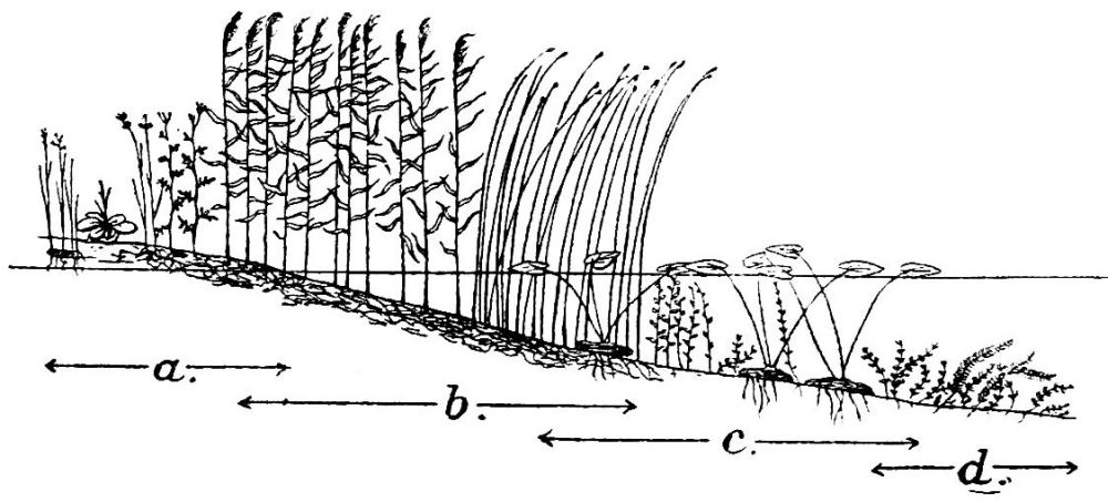 a, Marsh zone; b, reed zone; c, zone of floating vegetation; d, zone of submerged vegetation.