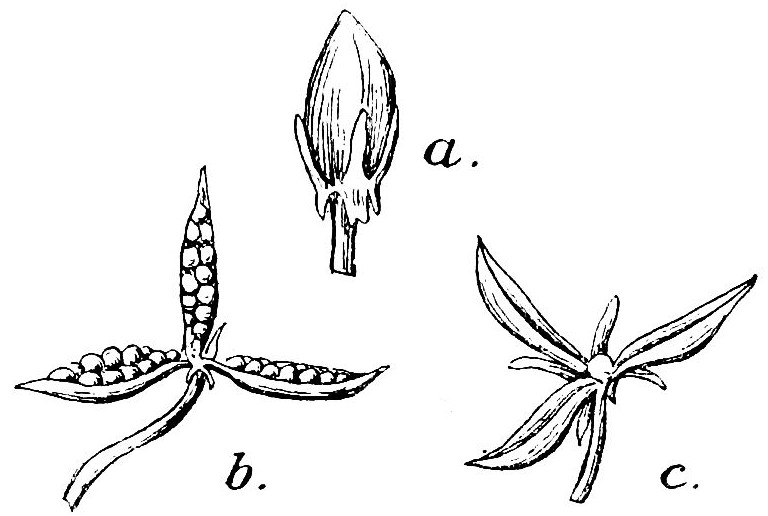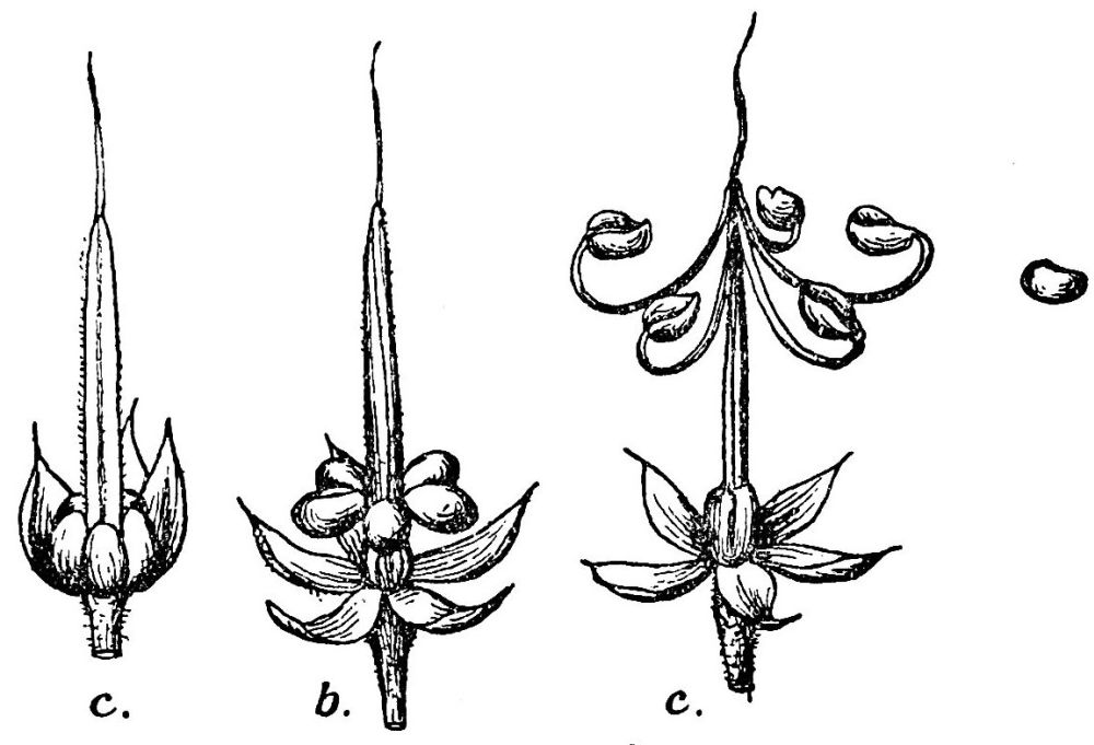 a, Mature; b, ditto, with pouches raised ready to discharge nuts; c, in act of discharging.