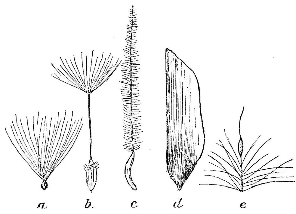 First of all, as to the nature of the seeds with which we have to deal. These are, as already pointed out, young plants, already a long way advanced from the egg stage, neatly tucked up and enclosed, in most cases along with a supply of food material, in a tight, strong skin, which is mostly of a particularly impervious character, protecting the young plant from injury by bruising, from attacks of small animal enemies, from extremes of heat and cold, of moisture and dryness. The young plant, too, is in a peculiarly resistant physiological condition. For instance, its breathing—or absorption of oxygen—is exceedingly slow, and it is{52} not suffocated by burial, sometimes even for years, in the soil. And while the mature plant is killed instantly by immersion in boiling water or by exposure to a very low temperature, some seeds, if boiled for a quarter of an hour, are quite uninjured, while others, subjected experimentally to even the temperature of liquid hydrogen (-260° C., or 436 degrees of frost on our more familiar Fahrenheit scale), remain unaffected. Many seeds are liberated from the parent plant enclosed by or attached to appendages of various sorts (when they are called by the botanist fruits) which sometimes greatly aid dispersal, as in the Dandelion (Taraxacum), and sometimes appear to hinder it; in any case, while the young plant itself is usually quite small, it may, when surrounded by its food-supply and enclosed in its wrappings, be a bulky object—as is seen in the Cocoanut or Horse Chestnut. In the British flora, to which we may confine our attention, a crab-apple (containing a number of seeds), a hazelnut, and an acorn (each containing a single seed), are the largest units of dispersal with which we have to deal. But these are quite exceptional in size, and the average seed (using that term in its original sense of the natural unit of dispersal) in the British flora does not exceed the size of a pin’s head. This remarkable reduction of size alone aids dispersal greatly.