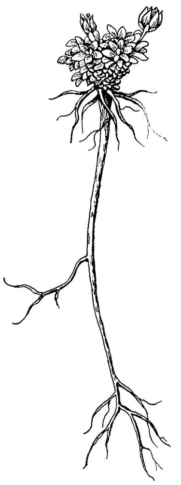 If, however, we consider some of the formations or associations which are the result of extreme conditions of environment, we get more light on the relations between the plants and the factors which control the vegetation. Take the case of the plants inhabiting desert regions such as were discussed in Chapter I. Here the outstanding feature is scarcity of water, and the plants display various remarkable adaptations which fit them for a thirsty life. There are three ways to meet scarcity of water—facilities for gathering it, arrangements for storing it, and economy in using it; and arrangements for all three are familiar features of desert plants. To effect the first, the root-system is extended, and is often enormously developed in proportion to the aerial parts. This adaptation may be studied in the flora of dry places in our own country, such as shingle beaches and sand dunes, which are characteristic semi-deserts. Take such plants as the Sea Holly (Eryngium maritimum), the Sea Convolvulus (C. Soldanella), or the Sea Sedge (Carex arenaria), and compare the extent of the root-system or underground stems with that of the aboveground portions. Fig. 4 represents the Wild Carrot (Daucus Carota) as found growing under extreme exposure on the west coast of Ireland. To meet the conditions the tall branched stem has been entirely dispensed with, and the terminal umbel is seated on the ground in the middle of a ring of leaves. In this way the plant prepares to resist both drought and wind. Water storage is often developed in different parts of xerophytes (drought-resisting plants)—in roots, or stems, or leaves, which become much enlarged, and at the same time covered with a{37}