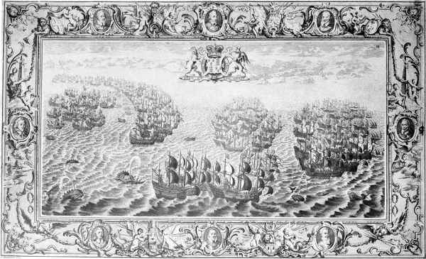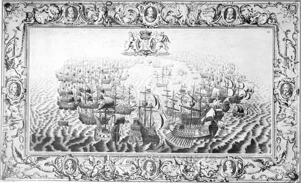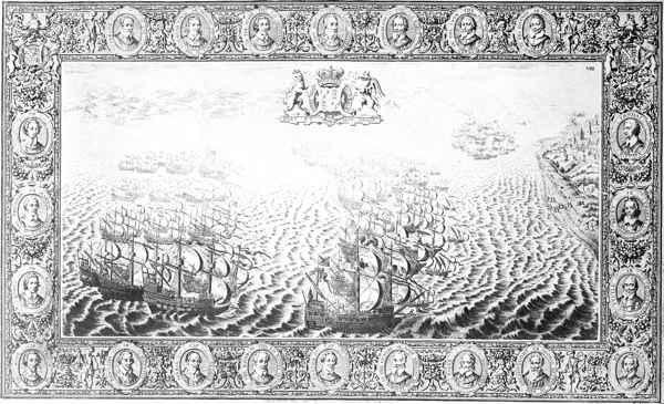 THE Defeat of the Spanish Armada being the most glorious Victory that was ever obtained at Sea, and the most important to the British Nation, every Method deserves some Praise, that may in a suitable Manner propagate the Memory of it. Our Ancestors, that were personally interested in it, were so careful it should not pass into Oblivion, that they procured the Engagements between the two Fleets to be represented in ten curious Pieces of Tapestry, with the Portraits of the several English Captains, taken from the Life, worked in the Borders, which are now placed, some in the Royal Wardrobe, some in the House of Lords, the most august Assembly of the Kingdom, there to remain as a lasting Memorial of the Triumphs of British Valour, guided by British Counsels. But because Time, or Accident, or Moths may deface these valuable Shadows, we have endeavoured to preserve their Likeness in the preceding Prints, which, by being multiplied and dispersed in various Hands, may meet with that Security from the Closets of the Curious, which the Originals must scarce always hope for, even from the Sanctity of the Place they are kept in.