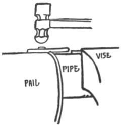 | MAKING A PAIL FROM A TIN CAN—CUTTING AWAY THE SURPLUS TIN AT THE RIM—FORMING THE LUGS FOR THE HANDLE—RIVETING THE LUGS IN POSITION—FORMING A WIRE HANDLE | ||