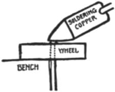 Soldering is by far the most important of the operations involved in tin can toy making. But it is very simple, once it is understood. When the[5] principles that govern the process of soldering are thoroughly mastered there is no difficulty at all about it. Chapters IV and V should be thoroughly read and re-read before trying to solder, and at least two practice pieces well soldered together before going any further.