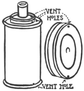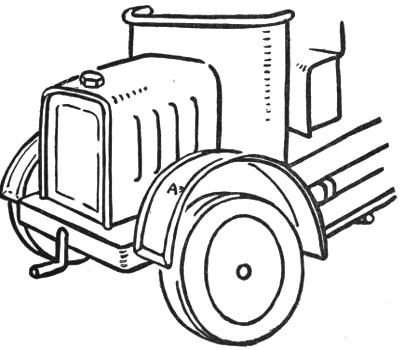 Look at the end of a small olive oil can or the end of a tin commonly used to contain cocoa, then think of the shape of the radiator and hood of the modern automobile. The shape of the can and the shape of the hood of the automobile are very much alike. A few holes punched in the end of the can in regular rows transform it into a miniature radiator in appearance, and some slits cut in the side of the can look very much like the vents in the side of a real auto hood. Solder the cap of a tooth-paste or paint tube in place over the radiator, and the hood and radiator are completed.