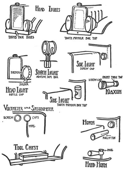 Wheels for rolling stock may be made from cans or the can lids. Small adhesive tape boxes make excellent headlights or searchlights and also pilot houses for tiny tug boats. Bottle caps, thumb-tack boxes, and the small screw tops of olive or cooking oil cans suggest head, side and tail lights for toy automobiles, and many other things.