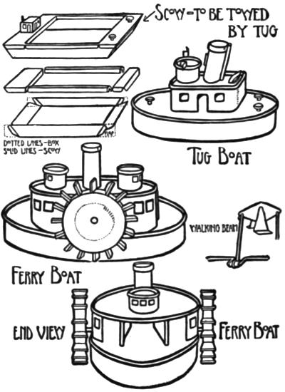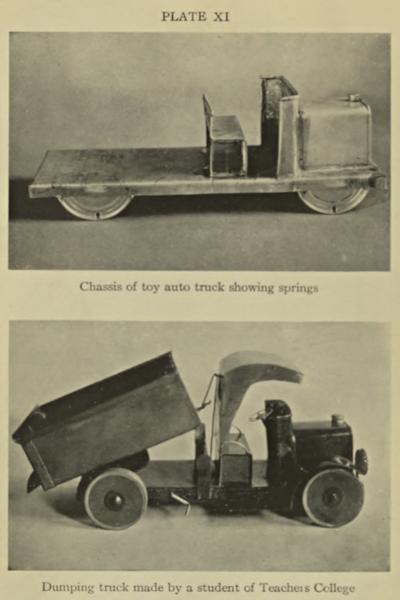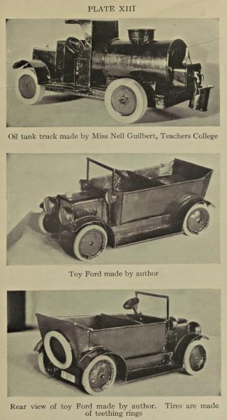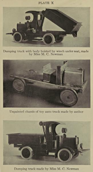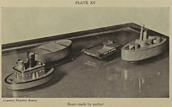 But, better still, working with the tin cans has developed the inventive faculties of my class to a surprising degree. The pupils have thought out and made many models of their own—not only toys but useful things as well. Various members of the class investigated the large trucks, automobiles, hoisting engines, locomotives, boats and such things seen in[3] any water-front community, to see how they were made and how they worked, and why. These pupils then returned to the school shops and made models of their own, many of which showed considerable invention and ingenuity.
