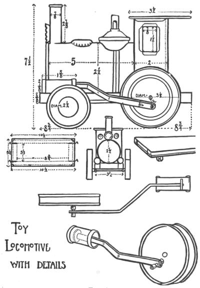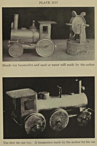 Tin can toys were invented after a fruitless search of the toy shops for a large tin locomotive. I had a long can in my shop at home that I thought could be very easily worked up into a toy locomotive boiler by adding a few fittings, such as a piece of tin rolled up into the form of a smokestack. Part of a small can could be used for a steam dome, or I could use the top part of a certain tooth-powder can, the distributor top of which would look very much like a whistle. A cocoa tin came in very handy for a cab, and a thumb-tack box served for a headlight. The wheels were made of can lids soldered together, and the toy locomotive was made, much to the joy of my very young son, who has had it in constant service for over a year, and it is still good for many trips at the end of a string.