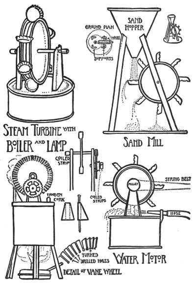 | WATER WHEELS AND SANDMILLS—A SIMPLE STEAM TURBINE AND BOILER—A WINDMILL AND TOWER—AEROPLANE WEATHERVANE | ||
