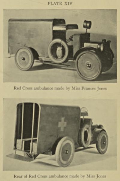 “For the officers’ wards, barracks, and recreation hut, we made tin candlesticks, flower holders, ash trays, electric light shades, tea trays, desk sets, and filing boxes. All of which were not only useful but quite ornamental, as they were attractively painted and decorated by the patients. The soldiers took great interest in the making of mechanical toys, especially war-like ones, such as tanks, aeroplanes, cannon and army trucks.
