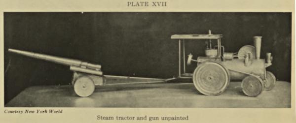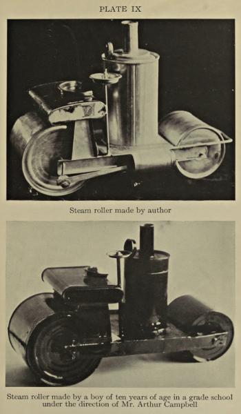 The steam roller, shown in Plate XI, was made by a boy of ten after a model which I made for it. This same boy developed quite a trade of his own by soldering up various pieces of tinware for his mother and the neighbors.