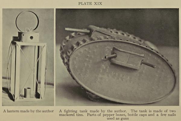 Many different kinds of boats that will really float may be made from mackerel and herring tins which are usually made in the shape of boats. Two mackerel tins soldered together suggest the fighting tank. Only a little work is necessary to transform these cans into real toys.