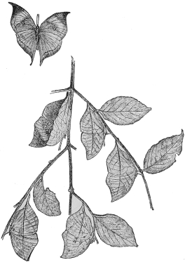 More special modifications for the same purpose are shown in the adjacent bay on the east side of the hall by Insects which closely resemble the objects, such as leaves, twigs, etc., among which they dwell. The close imitation of a dead leaf, presented by the Leaf-Butterfly (Callima inachis), when its wings are closed, could not be surpassed. In a further stage of the same condition, called “Mimicry,” the object resembled, or mimicked, is another living animal, belonging to a different species, family, or even order. The resemblance in these instances is also believed to be for protection, or to be in some way advantageous to the animal in which it occurs. We know, however, so little of the habits and life-history of animals in a state of nature that many of the purposes supposed to be served by particular colours or appearances can only be regarded at present as conjectural. Whatever be the real explanation, the facts shown by the specimens in this bay are very curious, and worthy of careful consideration.