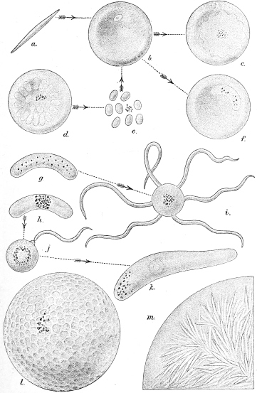 a, malarial germ, or sporozoite, as introduced into the blood by the mosquito; b, sporozoite after entry into blood-corpuscle; c, growth of sporozoite into an amœbula; d, division of amœbula to form merozoites; e, liberated merozoites; f, growth of merozoites into a crescent at expense of corpuscle; g, male, and h, female crescent; i, male cell with projections, which lengthen and are set free as spermatozoa; j, fertilisation of ovum by spermatozoon; k, fertilised egg as the active motile vermicule; sphere formed from the l, enlarged vermicule, after this has bored through the stomach-wall of the mosquito; m, segment of sphere at final stage of development, containing countless needle-shaped spores, which, when it bursts, escape as sporozoites into the organs of the mosquito’s body and pass through the salivary glands into the proboscis, and so infect a man bitten or pricked by the mosquito.