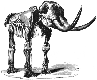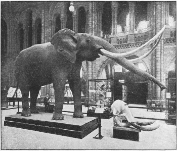 The front gallery, entered from the central hall, is devoted to Elephants and Sea-Cows, both living and extinct, and to extinct and fossil Mammals of other groups. Down the75 middle are placed a number of large and striking objects, of too great size to be contained in the wall-cases. The first is a nearly complete skeleton of the American Mastodon (fig. 41), an animal closely allied to modern Elephants, from which it is chiefly distinguished by the characters of its cheek-teeth. This is followed by a skeleton of the existing Indian Elephant (Elephas maximus), and the mounted skin of a tuskless male of the same species, brought home from India by His Majesty King Edward VII., when Prince of Wales. Further down the gallery is the skull of the extinct E. ganesa—remarkable for the immense length of its tusks—from the Siwalik Hills of India; and another of the Mammoth (E. primigenius), with huge curved tusks, in a perfect state of preservation, found in the Brick-earth at Ilford, Essex.20 Then follow skeletons of the great extinct Irish Deer (Cervus giganteus), male and female, the former distinguished by its magnificent spreading antlers, resembling those of a Fallow Deer on a large scale.