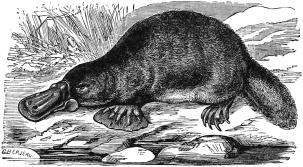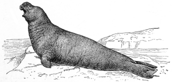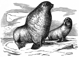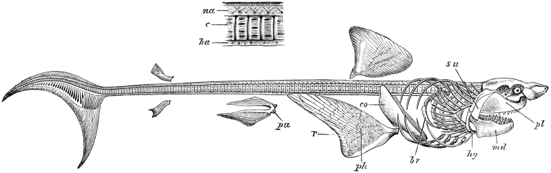 6. A Porpoise, adapted solely for swimming in the water. The fore-limbs are converted into flattened paddles, and the hind-limbs are entirely absent, their function being performed by the tail. The rudimentary pelvic bones are preserved.