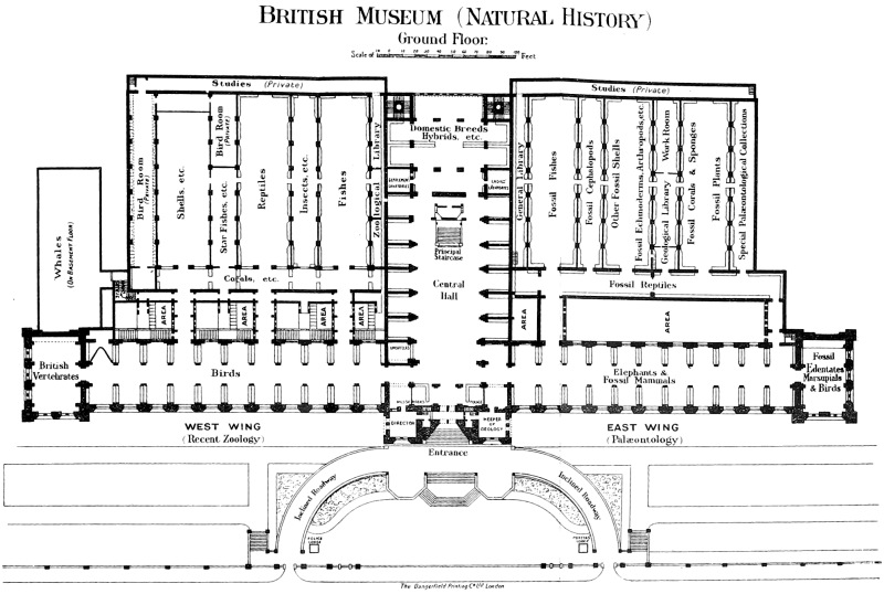 At the time of the foundation of the Museum, the site allotted seemed amply sufficient for its purposes; but gradually, as the collections increased, they outgrew the limits, not only of the original Montagu House, but even of its successor, the present classical building, completed in 1845 from the designs of Sir Robert Smirke. The erection of the magnificent reading-room in 1857 disposed for a time of the difficulty3 of finding accommodation for the ever-growing library; but the keepers of other departments continued urgent in their demands for more space, and after much discussion of rival plans for keeping the collections together and obtaining the needful extension of room by acquiring the property immediately around the old Museum, or for severing the collections and removing a portion to another building, the latter course was finally decided upon. At a special general meeting of the Trustees, held on the 21st of January, 1860, attended by many members of the Government in their official capacity, a resolution, moved by the First Lord of the Treasury, was carried “That it is expedient that the Natural History Collection be removed from the British Museum, inasmuch as such an arrangement would be attended with considerably less expense than would be incurred by providing a sufficient additional space in immediate contiguity to the present building of the British Museum.”