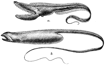 Of the galleries running northwards from the Fossil Reptile gallery, the one nearest to the central hall is used for the display of the Fossil Fishes, many belonging to groups now extinct. Perhaps the most remarkable of all, and certainly most unlike existing forms, are the armoured Devonian Fishes known as Cephalaspis, Pterichthys (fig. 54), etc. The well-preserved fishes from the Chalk are especially noteworthy, and a specimen of Portheus in a central case, 14 feet in length, is one of the largest bony fishes known.