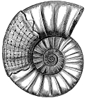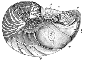 The next gallery contains the Cephalopods, a group of Molluscs abounding in extinct species, of which the Belemnites, Turrilites (fig. 55), and Ammonites (fig. 56) are some of the best-known. The form and structure of their nearest living representatives, the various species of Cuttle-fishes, Squids, Argonauts, and Nautilus (fig. 31, page 62) are illustrated by models, drawings, and specimens placed near the entrance of the gallery and along the top-line of the wall-cases. The third gallery contains the remaining Mollusca, with the Brachiopoda, Polyzoa, Echinoderma, Worms, and Crustacea; the fourth, the Corals, Sponges, Protozoa, and Fossil Plants. In these last two galleries most of the British specimens are placed in the table-cases, and those of foreign origin in the cases round the walls.