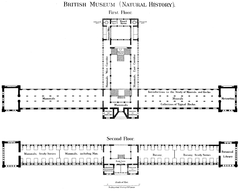 In some parts of the Museum the reserve collections are contained in drawers beneath the cases in which the corresponding exhibited portion is placed. This applies principally to the fossil specimens, the shells, and the minerals.14 The reserve birds and insects have special rooms devoted to them, and the extensive series of reptiles, fishes, and other animals preserved in spirit is kept, for the purpose of safety, in a separate building behind the Museum. In the Botanical Department the reserve collections are kept in the well-known form of an Herbarium, or Hortus siccus.