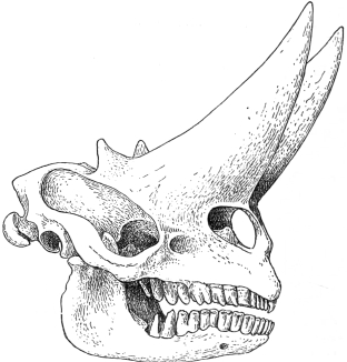 76 The next central case is occupied by the skulls and portions of jaws of a remarkable horned hoofed quadruped, Arsinoïtherium (fig. 42), from the Upper Eocene of the Fayum, Egypt. It belongs to an ancient group not closely related to any living animal.