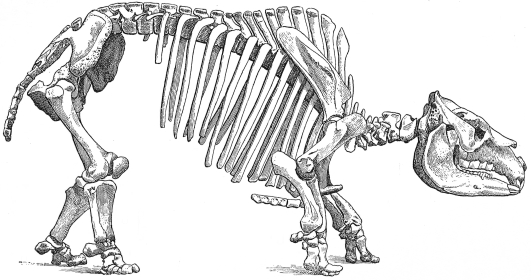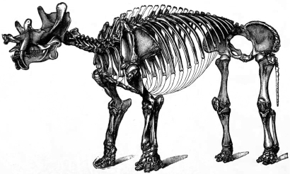 Near by is placed a model of a skeleton of the Dinoceras (fig. 44), one of the most remarkable of the many wonderful forms of animal life discovered in the Tertiary beds of the western portion of the United States of America. This animal combines in some respects the characters of a Rhinoceros with78 those of an Elephant, and has others altogether special to itself. The group to which it belonged became extinct in the Oligocene, or Middle Tertiary, period, without leaving any successors.