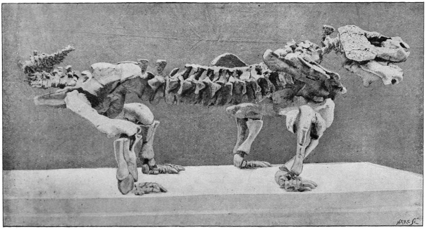 At the eastern end of the gallery are the Pterosauria or Ornithosauria, commonly called Pterodactyles or Flying Reptiles. Their most gigantic representatives were the species of Pteranodon from the Upper Cretaceous of Kansas (fig. 53). At the west end is the nearly complete skeleton of Pariasaurus (fig. 52) from the Karoo formation (Trias) of South Africa. It occurs also in Russia, and belongs to a primitive section of the Theromorphs, or Anomodonts, which include the ancestors of Mammals.