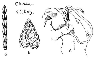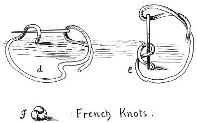 The silks employed are chiefly Floss. French floss or ‘stout’ floss, being rather thick and very smooth and bright, is useful for large, bold work; ‘Bobbin,’ ‘Church,’ or fine floss for finer work. Decca silk, which has a loose twist, may easily be split, and is useful for the brilliance of some of the dyes, different from any other to be met with in European makes.