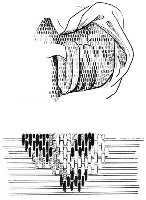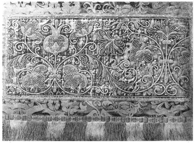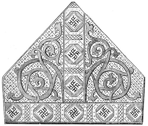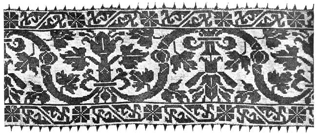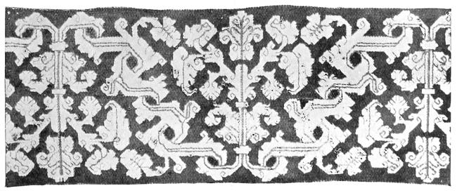 Some of the earliest forms of embroidery were, it is evident, direct copies of woven patterns, but these were quite appropriately placed, either on material which did not lend itself happily to being woven into patterns, or where the surface so decorated was too small to be worth while weaving; or again, where the ornamental material (such as gold and silk) was too precious to be lost on the under-side of the work, as would be the case in all woven work wherever the ‘ground’ shows between the patterns.