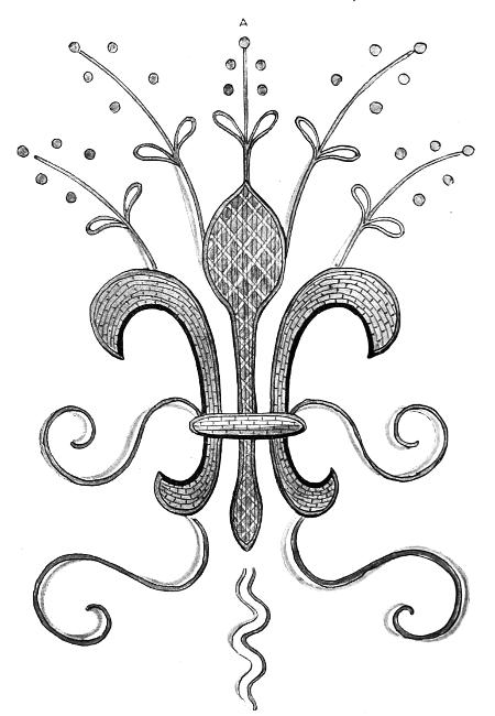 Plate is a flat wire, used chiefly in heraldic embroidery. It is laid over raised thread or string, with a stitch on each side of the thread, over which it is turned backwards and forwards till the thread is covered. In working Bullion, Purl, and Plate, the silk they are sewn with does not come into evidence at all. Strong fine thread is even better to sew them with than silk; both should be waxed.