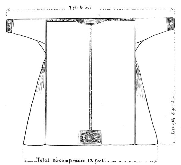 Passing, Japanese, and Chinese gold and silver are sewn down (generally by two threads together) with a fine twisted sewing-silk; the colour of the silk used affects considerably the colour of the gold-work, red producing a fine coppery glow; green, blue, and violet ‘cooling’ the gold; and yellow or gold-colour merely intensifying, or hardly modifying it at all.