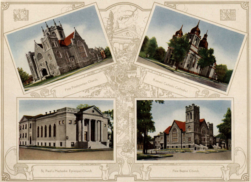 The illustrations show four of the more impressive church structures of Wichita. In the upper left corner is the First Presbyterian; opposite, the Roman Catholic Cathedral. In the lower left corner is St. Paul’s Methodist Episcopal Church, and opposite the First Baptist Church. Wichita has been the seat of the Catholic diocese of Wichita for more than a quarter century. The Cathedral was dedicated in 1912.
