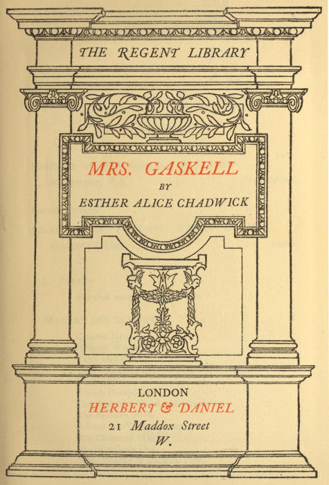 The Project Gutenberg EBook of Mrs. Gaskell, by Elizabeth Gaskell This eBook is for the use of anyone anywhere in the United States and most other parts of the world at no cost and with almost no restrictions whatsoever. You may copy it, give it away or re-use it under the terms of the Project Gutenberg License included with this eBook or online at www.gutenberg.org. If you are not located in the United States, you'll have to check the laws of the country where you are located before using this ebook. Title: Mrs. Gaskell Author: Elizabeth Gaskell Editor: Esther Alice Chadwick Release Date: August 2, 2018 [EBook #57627] Language: English Character set encoding: UTF-8 *** START OF THIS PROJECT GUTENBERG EBOOK MRS. GASKELL *** Produced by Anne Grieve and the Online Distributed Proofreading Team at http://www.pgdp.net (This file was produced from images generously made available by The Internet Archive)