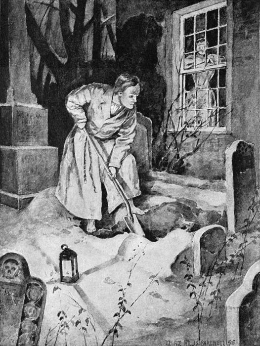 Letting his head fall forward in his hands he sat while the dreary hours moved on, but when the clock struck six he raised his forehead and facing the churchyard waited for the first coming streaks of light. And sitting so and waiting so we get our last glimpse of him before the hubbub and turmoil of the day set in, with the curious gaping crowd on the highway and the group among the graves, asking why the doctor had not come out, and why the sexton was the first to appear on the scene, and why he bore a pickaxe and a spade and looked as solemn as if he were going to dig a grave for the dead.