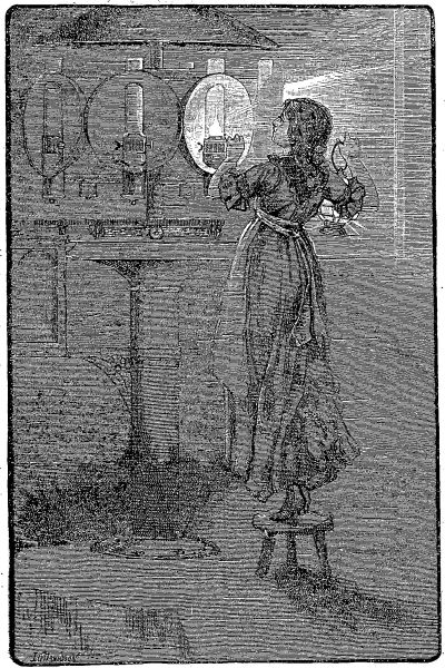 But this was only the beginning of Huldah's work. It was a chief part of the keeper's duty, she knew, to see that the lights burned undimmed throughout the night. Now, however, she must return to attend to the dame awhile. But as she turned to go there was a sudden crashing of the glass above her, a whirring swoop of some swift-winged creature overhead, a gust of wind, a flaring of the circle of lights, and then darkness, rayless, absolute. The storm moaned and shrieked in her ears, and Huldah shrieked too, hiding her face in her shawl.