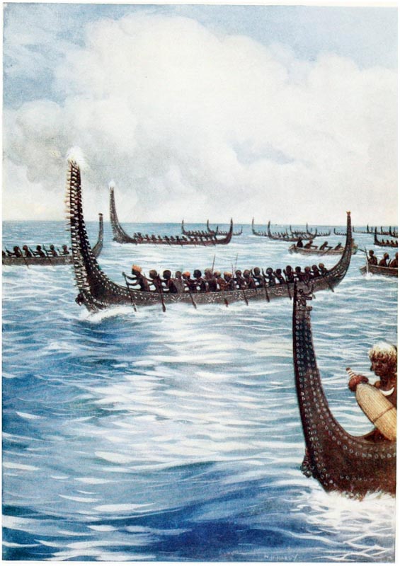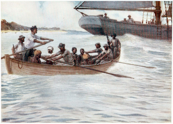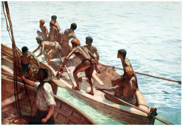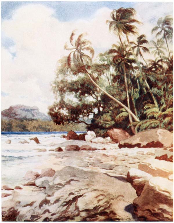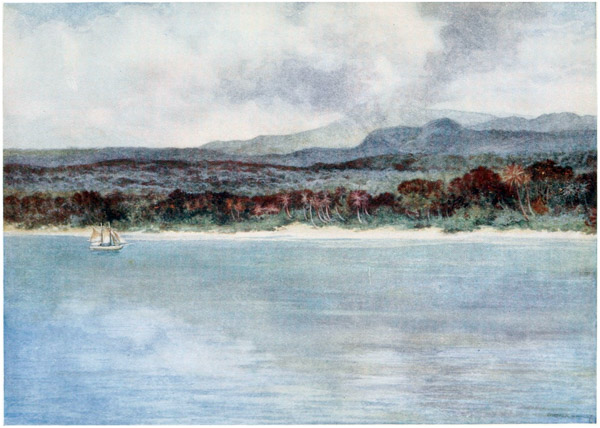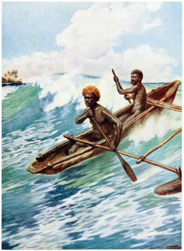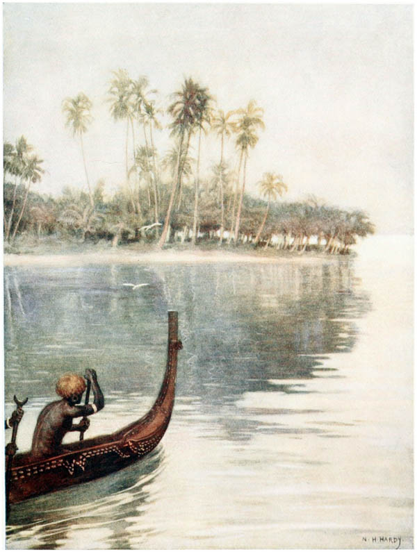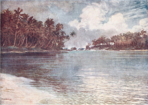 The deep blue of the sea, the clear bracing air, {15} the screech of the wild sea-birds, and the roar of the surf, as it breaks on the reefs, are sounds that echo in the memory. To awaken and hear all these things is the longing that clings to one. To feel a good ship gliding through the still waters on the way to the islands; to rise from one’s bunk and through the port-hole to catch a glimpse of the rugged shores and the dark, shining skins of the natives as they paddle out in swarms from the villages to the ship’s side; to hear them calling to one another and yelling their greetings to the crew, are things which, when once experienced, can never be forgotten, and will ever haunt the memory.