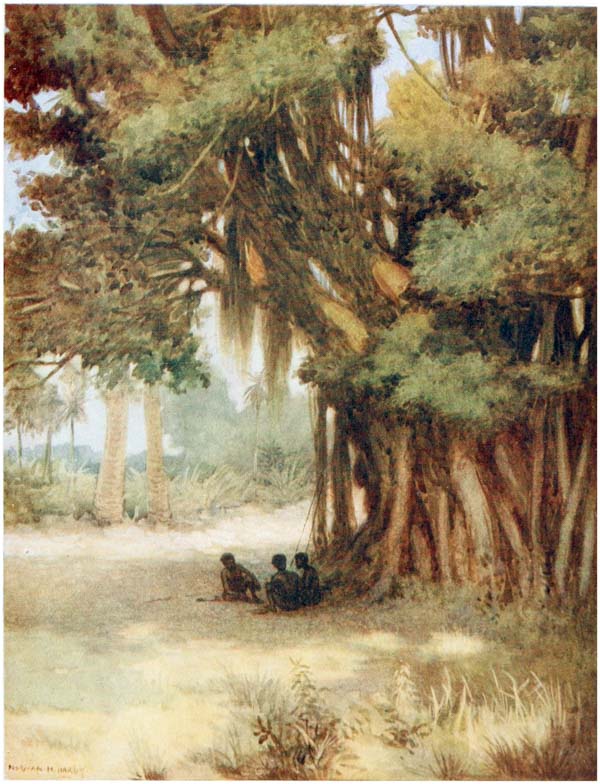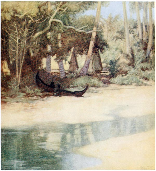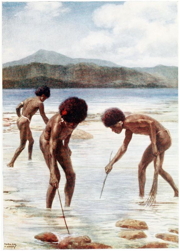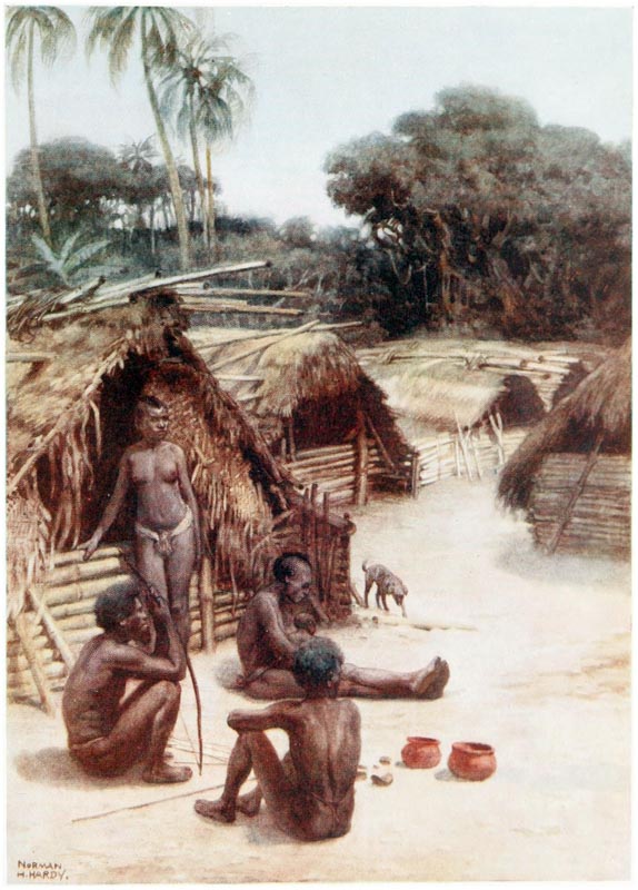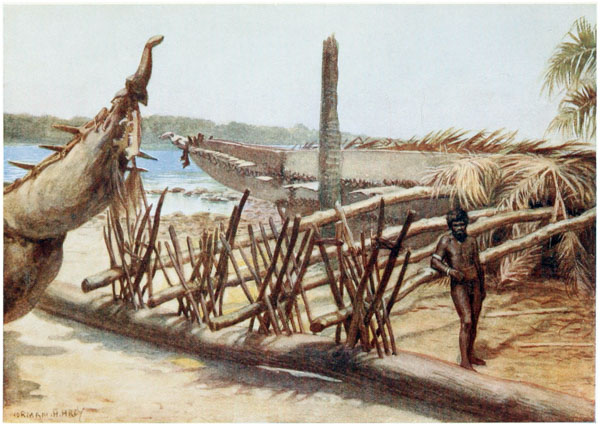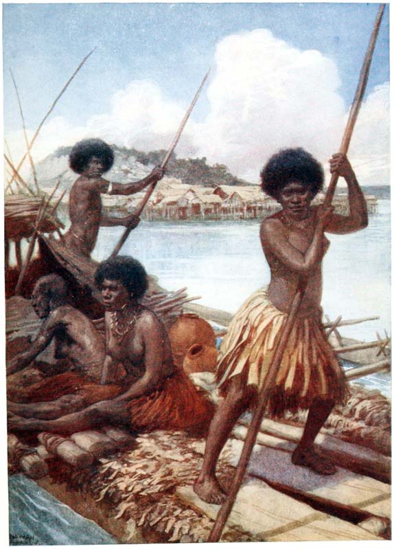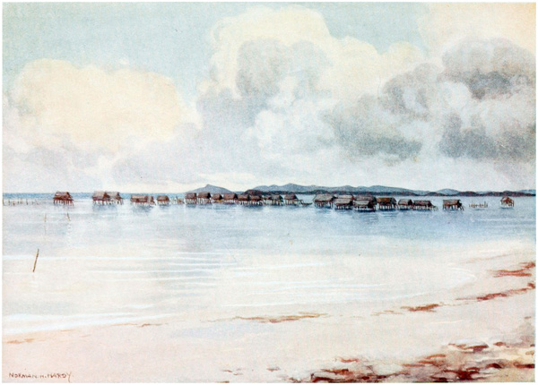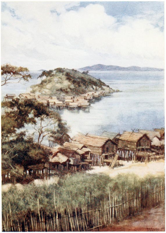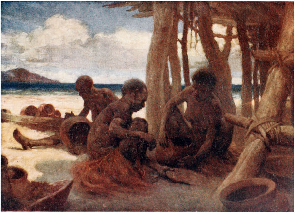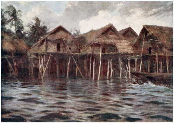 Under the houses, when the tide is out, the natives can be seen cutting out their canoes, making their pottery, repairing their fishing gear and attending to other duties; but they much prefer to loll about on the verandahs of their huts, looking out at the sea, thinking of nothing.