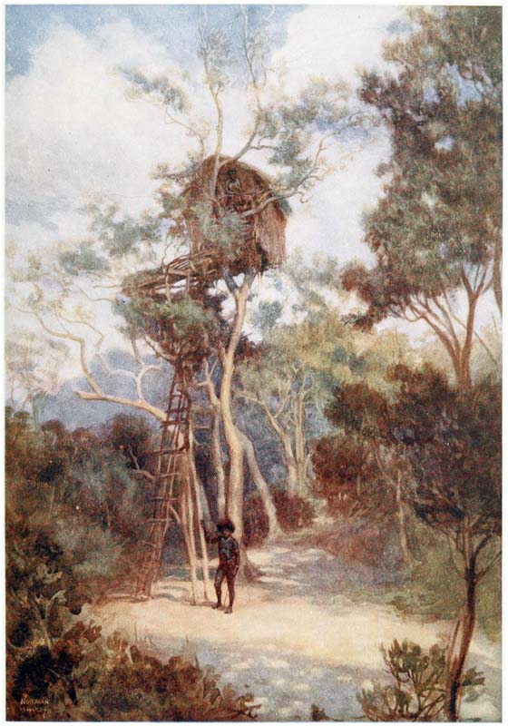 The whole of Elevera only covers about ten acres, but in that space the huts are crowded together, and give cover to hundreds of healthy and prosperous-looking inhabitants. On the mainland the houses are built on small pile platforms, only three or four feet from the ground, whilst others in the back country are built in trees and look like gigantic birds’-nests. This last custom, however, has quite died out, for with the introduction of the axe the protection of a house in a tree would be of little use, for one blow would fetch the whole construction down. Also the introduction of the police and the work of the Government have so diminished the {22} chances of tribal wars that the native no longer goes to such trouble. In the old days the inmates of these nests kept a supply of stones and spears on their verandahs, and were able to use them with great effect on their troublesome neighbours below. Now such a position would only make them good marks for a rifle shot.