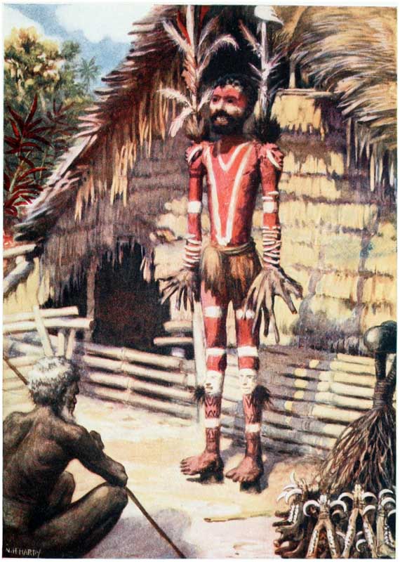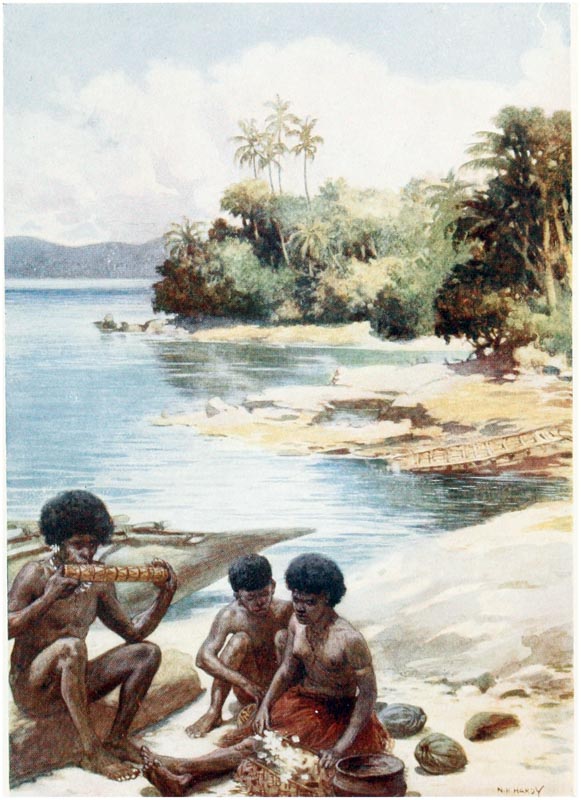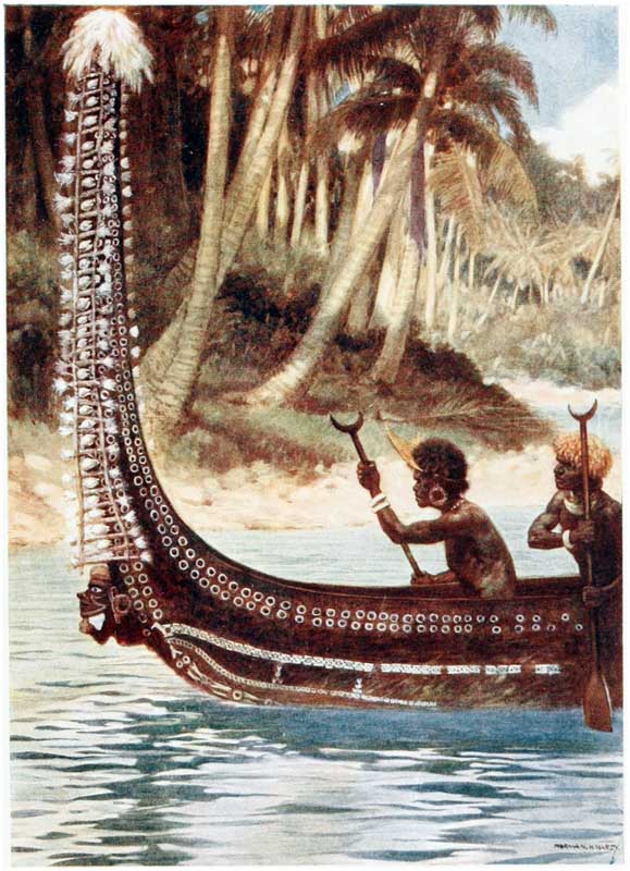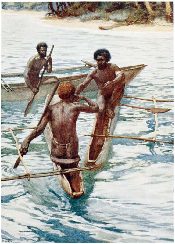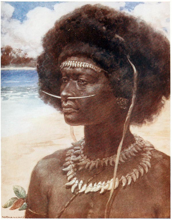 There no islands in the new world which have been the scene of greater adventures, more daring exploits, and more exciting times than those in the South Seas. From the earliest days New Guinea, New Britain, Solomon Islands, and the New Hebrides have been inhabited by a race of savages, on whom neither the efforts of missionaries nor the oaths of traders have been able to make much impression. For years the white man has tried in vain to break the spirit of these cannibals; with fire and sword whole villages have been swept away, but neither by fear nor by kindness have the natives been weaned from their worst customs, and it will take many years and much education, and perhaps the complete extinction of the old generation, before they cease to be savages. For over sixty years {14} the missionaries have been working amongst them and have taught many to read, and sent them out amongst their brethren armed with Bibles and tracts in their native languages, but all this has been of little avail; every day we hear of massacres and risings, and missionaries and traders are pounced on and murdered, and there is no accounting for these outrages which make the problem more difficult to solve. For months or even years men may live on the friendliest terms with a tribe, and then suddenly, and for no apparent reason, the natives will rise up and slay them. The whim of a chief, an angry word, a bad bargain, a superstitious fear, any of these trivialities may be the cause of a rising, and may mean the death of dozens of innocent people.