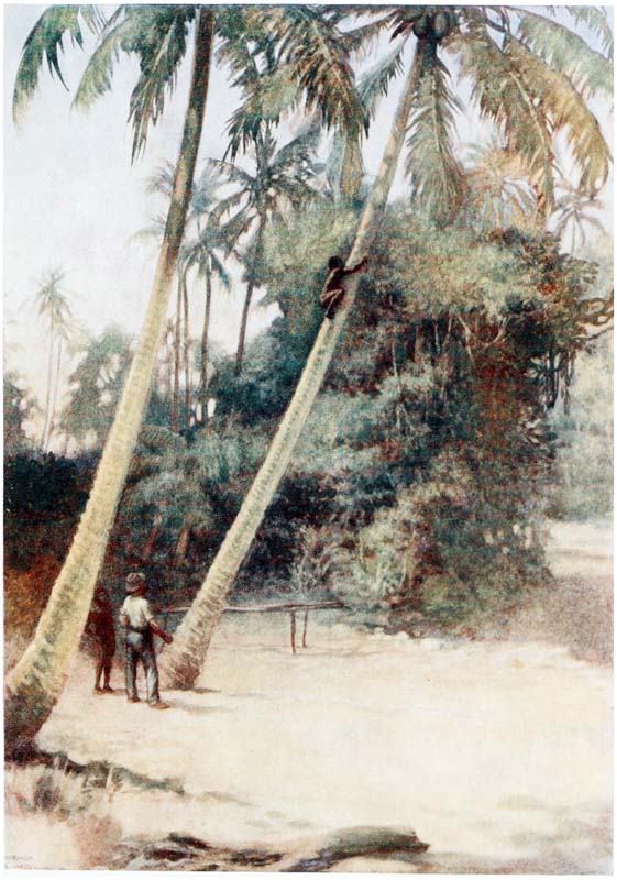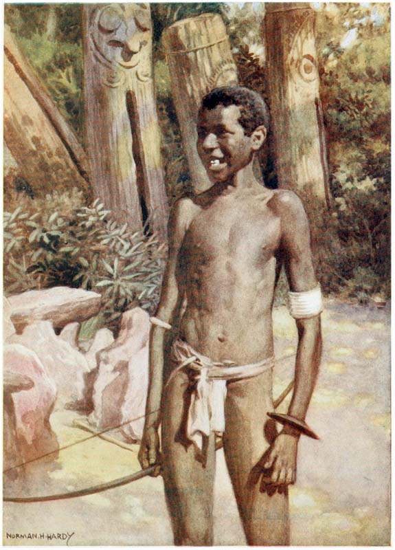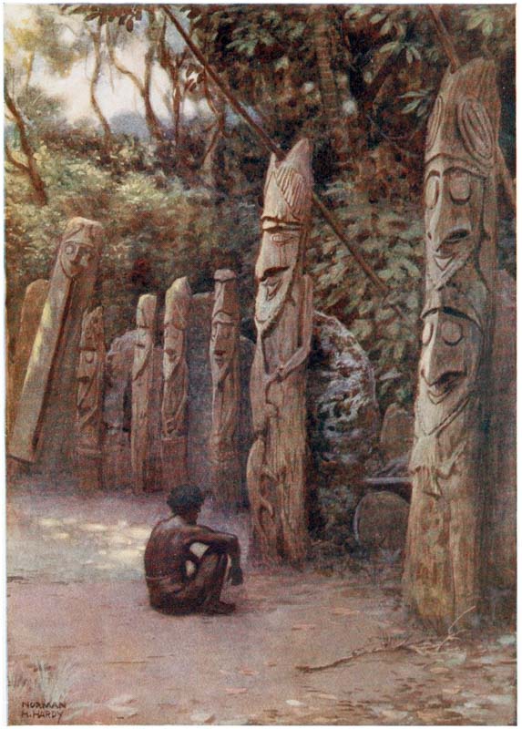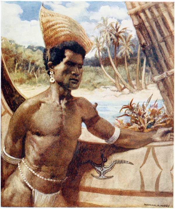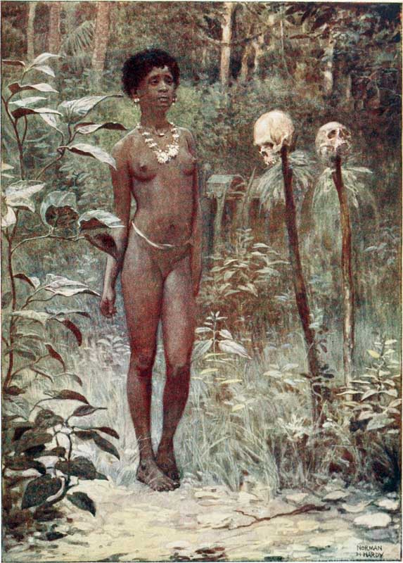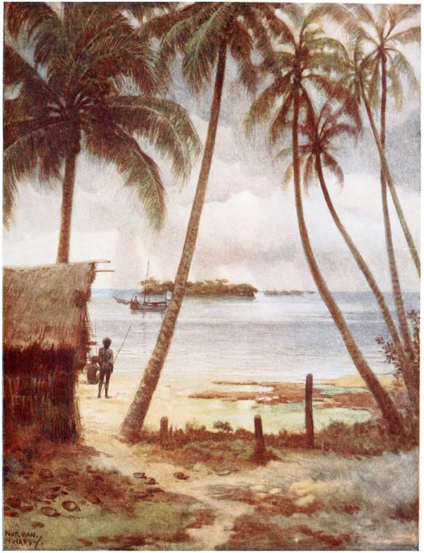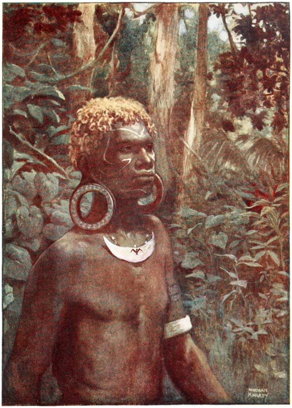 But come, let us see these islands where the sun pours down on bright yellow sands through the long, waving, rustling leaves of the palm trees, and glistens on the skins of the crocodiles basking in the rivers, and on the strong, brown arms and tanned faces of the traders, who have braved all dangers for a life of adventure. Let us look into the quaint lives of the natives—the last relics of barbarism; let us see their huts and join in their weird ceremonies and listen to their songs and learn their superstitions, for in a few years these things will be gone, and the cyclist and the tripper will be crowding these savage islands, whilst the sturdy {16} head-hunters will be dead, and their sons will be cadging pennies, whilst the dark, shy girls will be bold and talk with nasal accents.