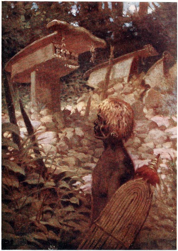 No furniture or mats are to be seen in these dwellings to catch the dust, and you can squat on the floor and see through the planks the waves washing and swelling a few yards below. The floor consists of the same kind of piles, only flatter and broader than those used for supporting the house. The platforms are arranged like big steps, and many of the boards are beautifully carved. {19} Some of them are immense pieces of timber, which must have required a deal more energy to cut than the Papuan of to-day is capable of exerting—much less would he put them into position.