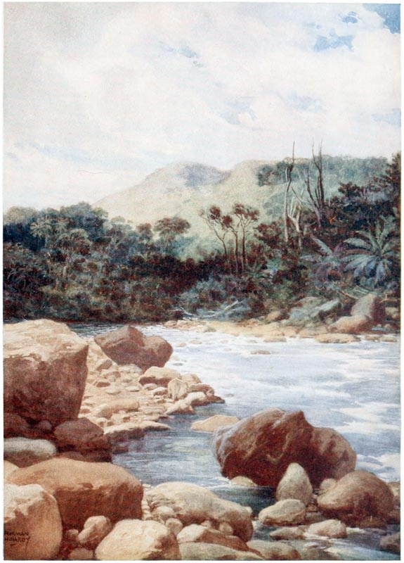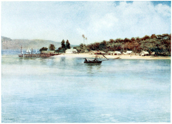 The capital of New Guinea is Port Moresby, a quaintly picturesque village facing a large bay with a natural harbour. In the vicinity are densely wooded hills, which stretch up and disappear in the distance—a dark-green and black mass. But when the sun is on them they dance with colour, and the tints of marvellous brilliancy turn them into a lovely fairyland, full of romance and adventure. It is wonderful what strange tales flit across the mind when looking at these hills; what scenes have been enacted there in times gone by, and now, how calm they seem!