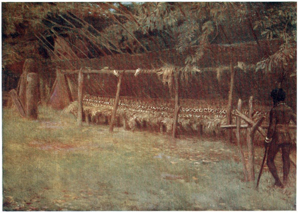 The rank yellow smoke which curls round her does not inconvenience her in the least. She takes no heed of it, but blows away at the embers, regardless of smarting eyes and choking throat, probably because she feels neither. She never fears that the fire will spread and burn down her home, but just goes on cooking. If you speak to her she may stop blowing for a second and glance up at you, but never a word passes her lips, and soon she will be blowing again as if it was quite an ordinary thing to have a white man staring at her. But though the smoke does not trouble her a bit, it blinds you, and you soon hurry on to the {20} next hut, and there confine your attention to its outside.