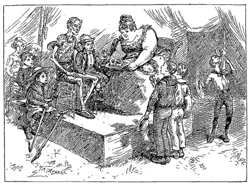 It did not require much search on Toby's part to find[Pg 454] the tent wherein the skeleton and his wife exhibited their contrasting figures, for the pictures which hung outside were so gaudy, and of such an unusually large size, that they commanded the attention of every visitor.