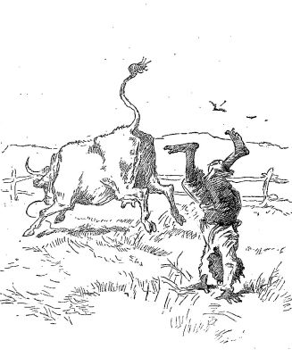 But in spite of his ill-temper, of which hunters are never tired of speaking, the rhinoceros certainly has a love of fun. An English hunter in South Africa had gone to bed in his travelling wagon one night, leaving his native servants feasting around the camp fire. Suddenly he heard a terrible uproar, and looking out, discovered that a rhinoceros was having a little fun in the camp. The air seemed to be full of tin pans, and natives, and blankets, and fire-wood, which the rhinoceros was tossing, and the natives, whenever they could get breath enough to express their views of the situation, were calling for help. The hunter did not interfere with the animal's amusement, and presently the rhinoceros buried his horn in a red blanket, which covered his eyes and blinded him. In this condition the beast started to run away, and as he vanished, the hunter could hear him stumbling and knocking his head against all the trees and nearly all the rocks in that particular part of Africa.
