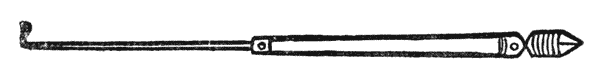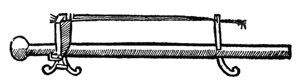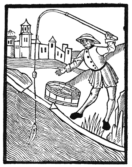 After the eloquent pleading for angling with which the treatise opens, the lady at once proceeds to teach the making of the “harnays” of it. The rod she orders to be constructed somewhat resembles, save in its larger size, the modern walking-stick rod. A hazel wand, or failing it, one of willow or mountain ash, is to be procured, as thick as the arm and nine feet in length. This is to form the butt, and is to be hollowed out by means of divers red-hot irons into a tapering hole, which is to receive the “croppe,” or top, as we now call it, when not in use. This “croppe” is to be made of a yard of hazel, joined to a length of blackthorn, crab, medlar, or “jenypre.” All these are to be cut between Michaelmas and Candlemas, the lady giving very particular directions as to their drying and the like. When the two portions of the “crop” are “fretted together,” the whole rod is to be shaved into a shapely taper form; the staff encircled with long hoops of iron or latten at both ends, and finished with a “pyke in the nether ende fastnyd wyth a rennynge vyce : to take in & oute youre croppe.” The line is then to be wound round the crop and tied fast with a bow at the top. The reader will note that there is no mention of a reel; it was only used, seemingly until the beginning of this century, for large salmon and pike. An angler who hooked a fish when armed with this ponderous rod (which must from its description have been nearly eighteen feet long, as large as a modern salmon rod), would act as Izaak Walton would have done in the like predicament,—throw the rod in to the fish and recover it when he could. But the lady is wonderfully pleased with this mighty rod, and thus concludes—“Thus shall ye make you a rodde soo preuy that ye maye walke therwyth : and there shall noo man wyte where abowte ye goo. It woll be lyghte & full nymbyll to fysshe wyth at your luste. And for the more redynesse loo here a fygure,” and she adds the curious woodcut which the reader may see reproduced at page 5.